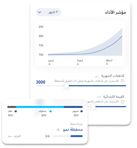 حل ذكي وسريع للاستثمار طويل المدى،عبر محافظ مصممة من قبل خبراء لتناسب احتياجاتك. مع المحفظة التقاعدية، تبدأ استثمارك بثلاث دقائق فقط، بسهولة تامة وتوفير لوقتك الثمين.